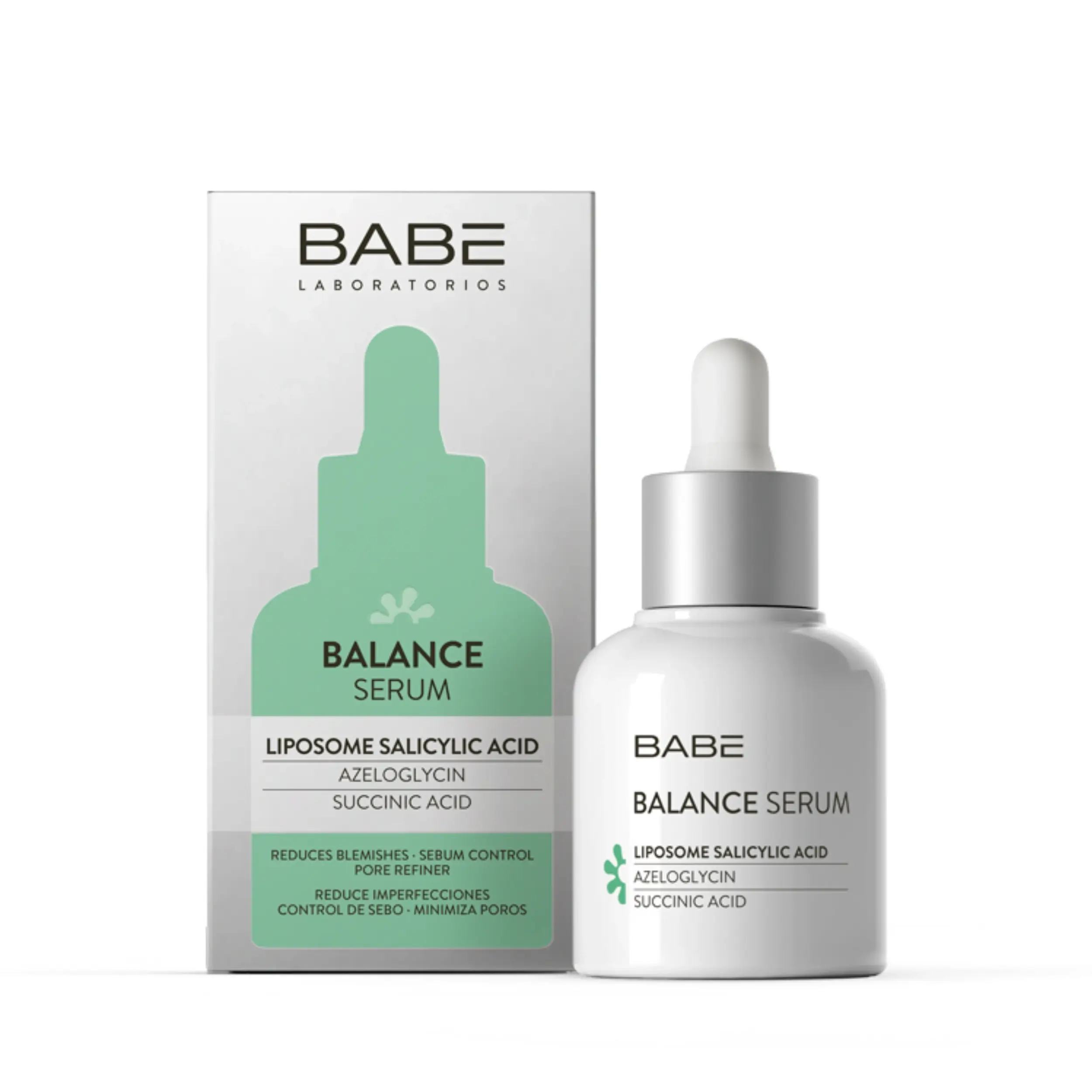 Babé Balance Serum has been formulated to treat the visible signs of acne-prone adult skin. Its advanced formula reduces marks and imperfections, while visibly improving skin texture. Thanks to the synergistic action of high-potency active ingredients, such as liposomal Salicylic Acid, Succinic Acid and Azeloglycine, which act on all layers of the skin, it controls excess sebum, minimizes pore size and softens the skin. In addition, its content of Hyaluronic Acid and Prebiotics keeps the skin hydrated, balances and strengthens the skin barrier. Its light, fast-absorbing texture melts into the skin without leaving an oily or sticky sensation. The result is smoother, more even and mattified skin.
