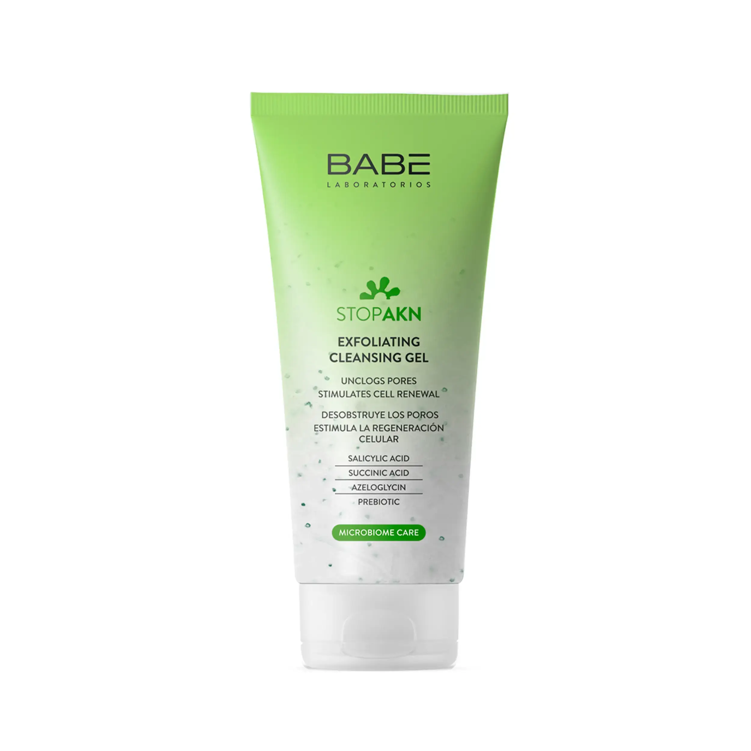 Babé Stop AKN Exfoliating Cleansing Gel an exfoliating cleansing gel with a combination of particles of different sizes, which guarantees effective cell renewal to improve skin texture. This cleansing product, when it comes into contact with the skin and water, forms a subtle foam that cleans in depth, unclogs pores and stimulates cell regeneration. Its aloe vera and charcoal particles provide a calming effect. It also contains PRE/POST-BIOTICS to care for the microbiome. Balances and softens the skin, respecting the skin barrier.