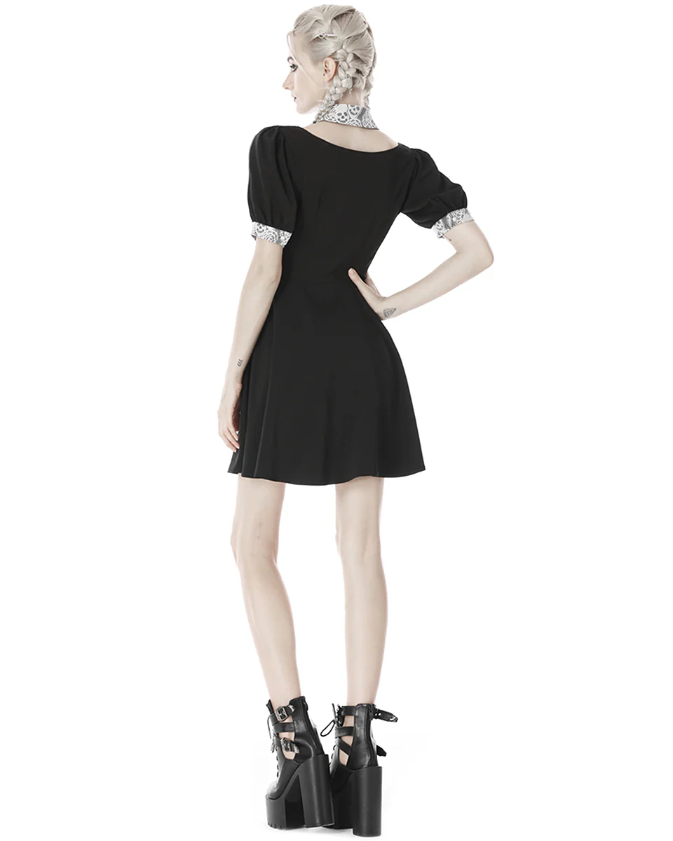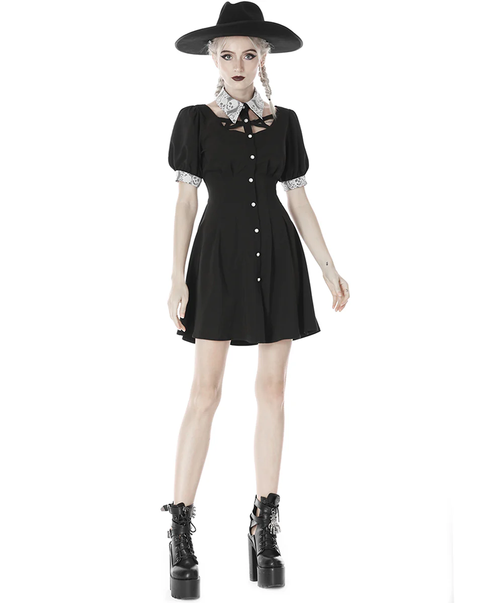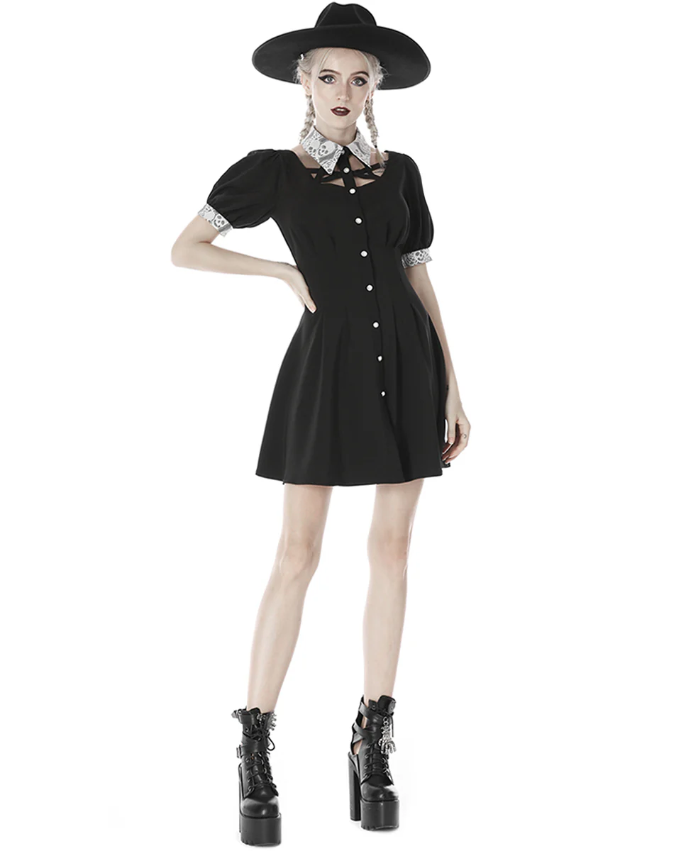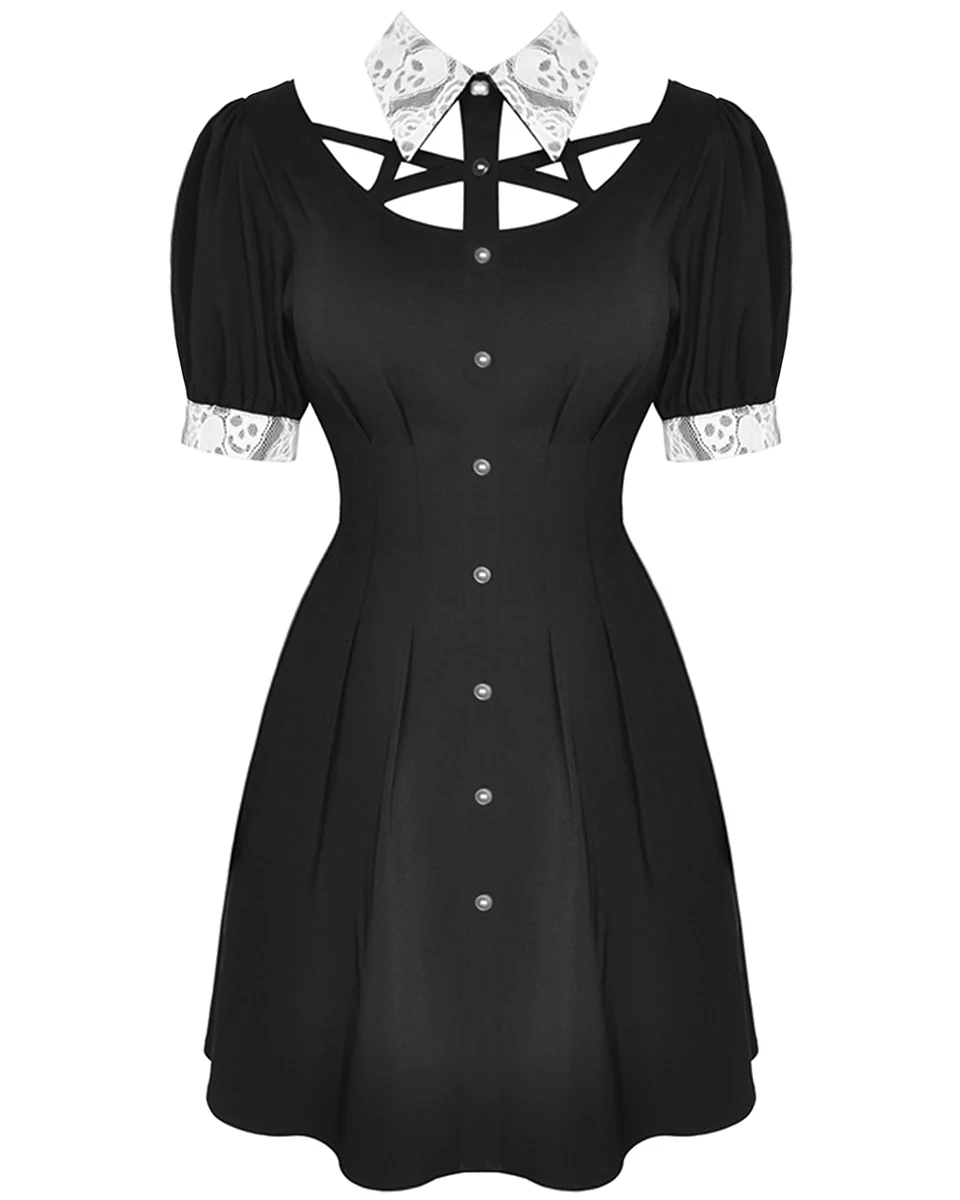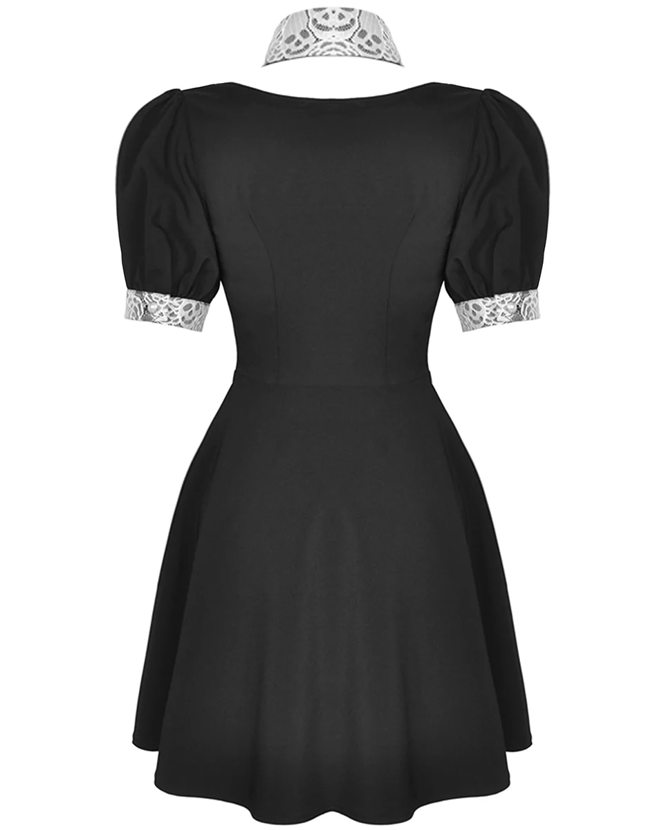Crafted from soft black sateen polyester blend in a unique neo-Victorian and modern Witchcraft inspired design, featuring a statement semi-sheer white lace contrast collar and cuffs with intricate cutout skull pattern embroidery.