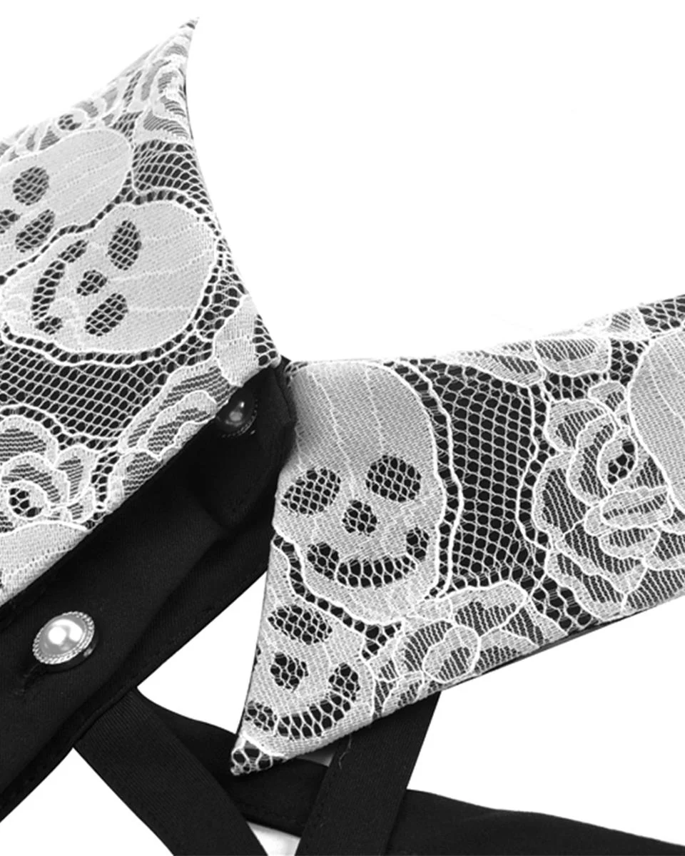 Traditional pointed collar with elaborate white floral skull lace overlaye, and short, exaggerated puffed balloon sleeves with fitted cuffs, featuring a matching skull lace overlayer.
