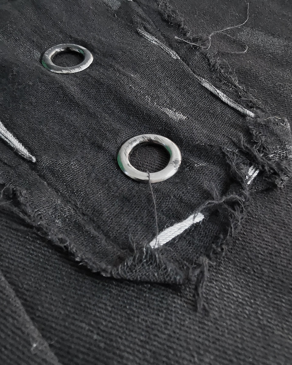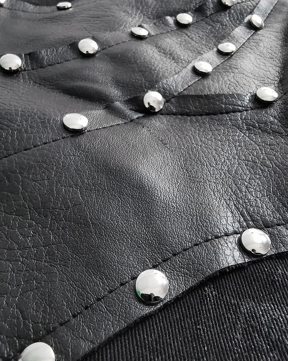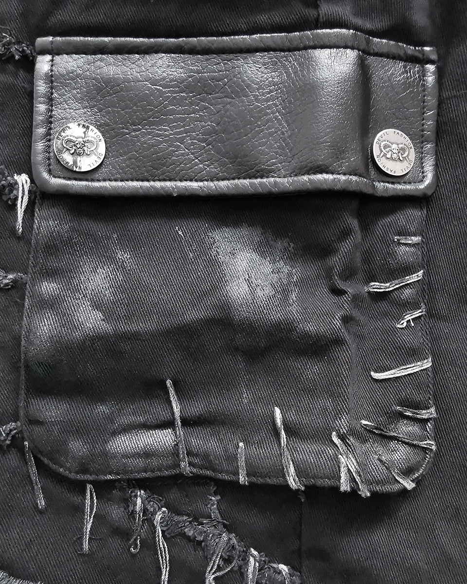 Asymmetrical design with features including riveted black faux leather layering and rough-stitched patchwork with metal eyelets, complete with contrast faux leather back poket and cargo pocket to one side with heavy duty snap fastenings.