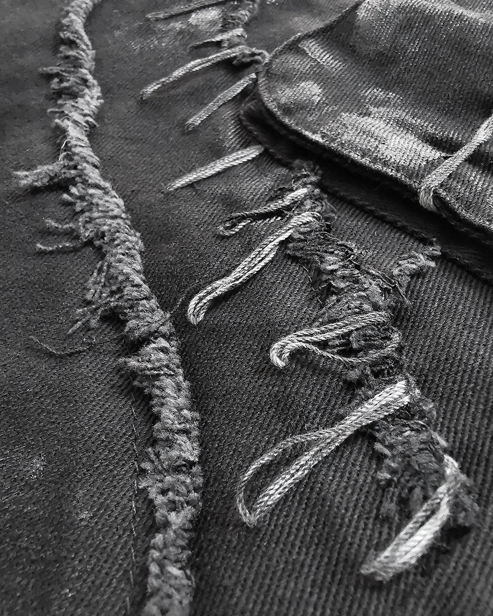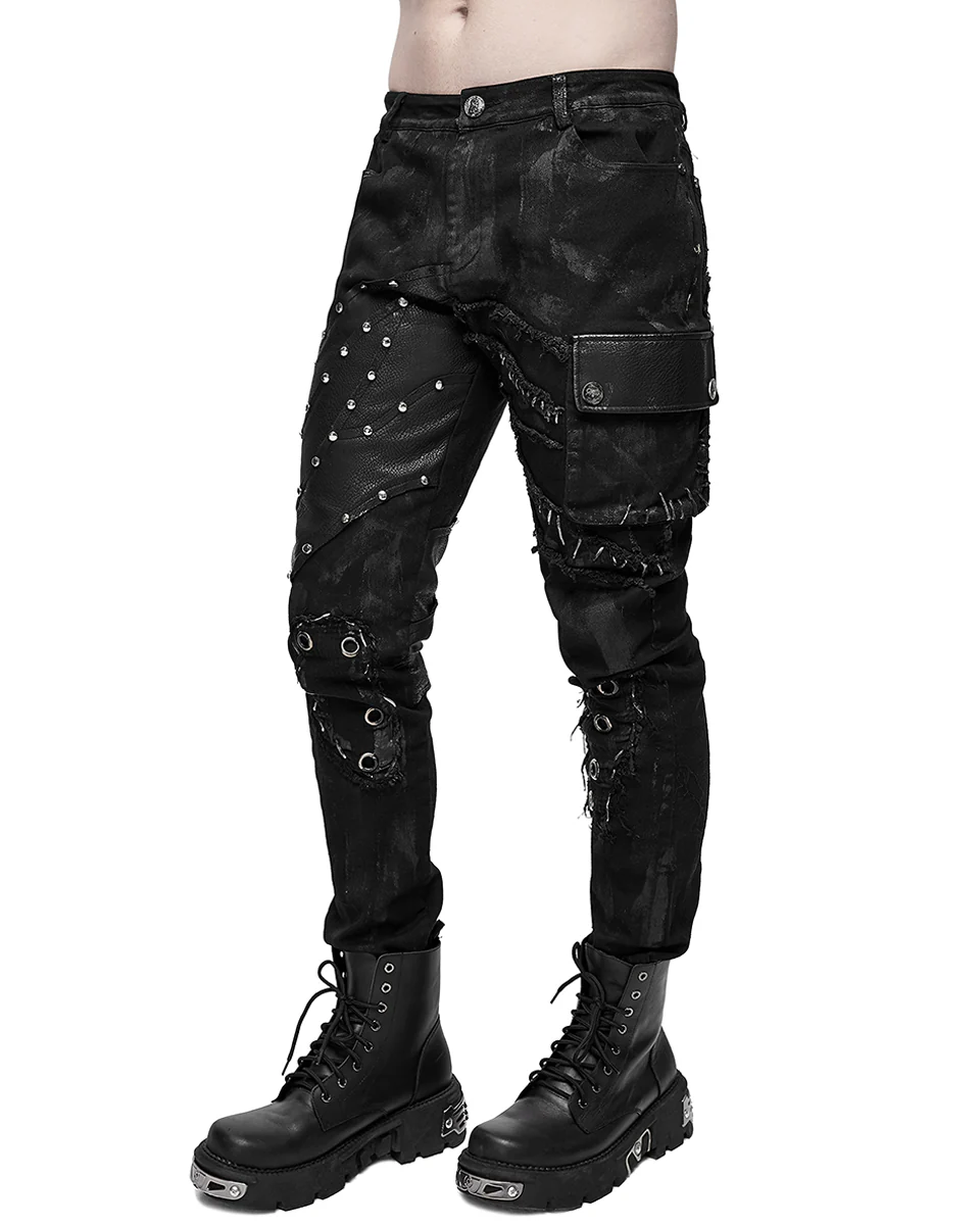 Cut from top quality black cotton twill with custom colour washing effect and random paint-spattered coating and black PU faux leather accents, these jeans drip with Punk attitude and the grime of the Dieselpunk aesthetic.