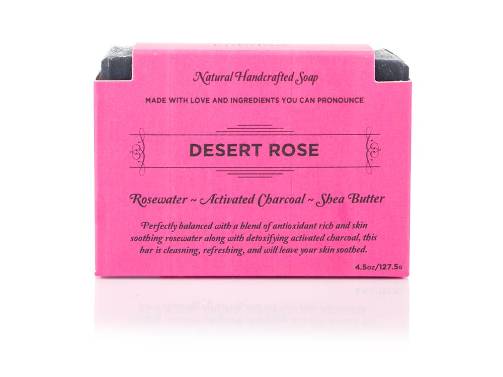 Our Desert Rose bar soap is meticulously crafted with in-house made rosewater along with activated charcoal and shea butter. This perfectly balanced blend is rich in antioxidants and detoxifying elements with a rose scent sure to make your senses bloom.