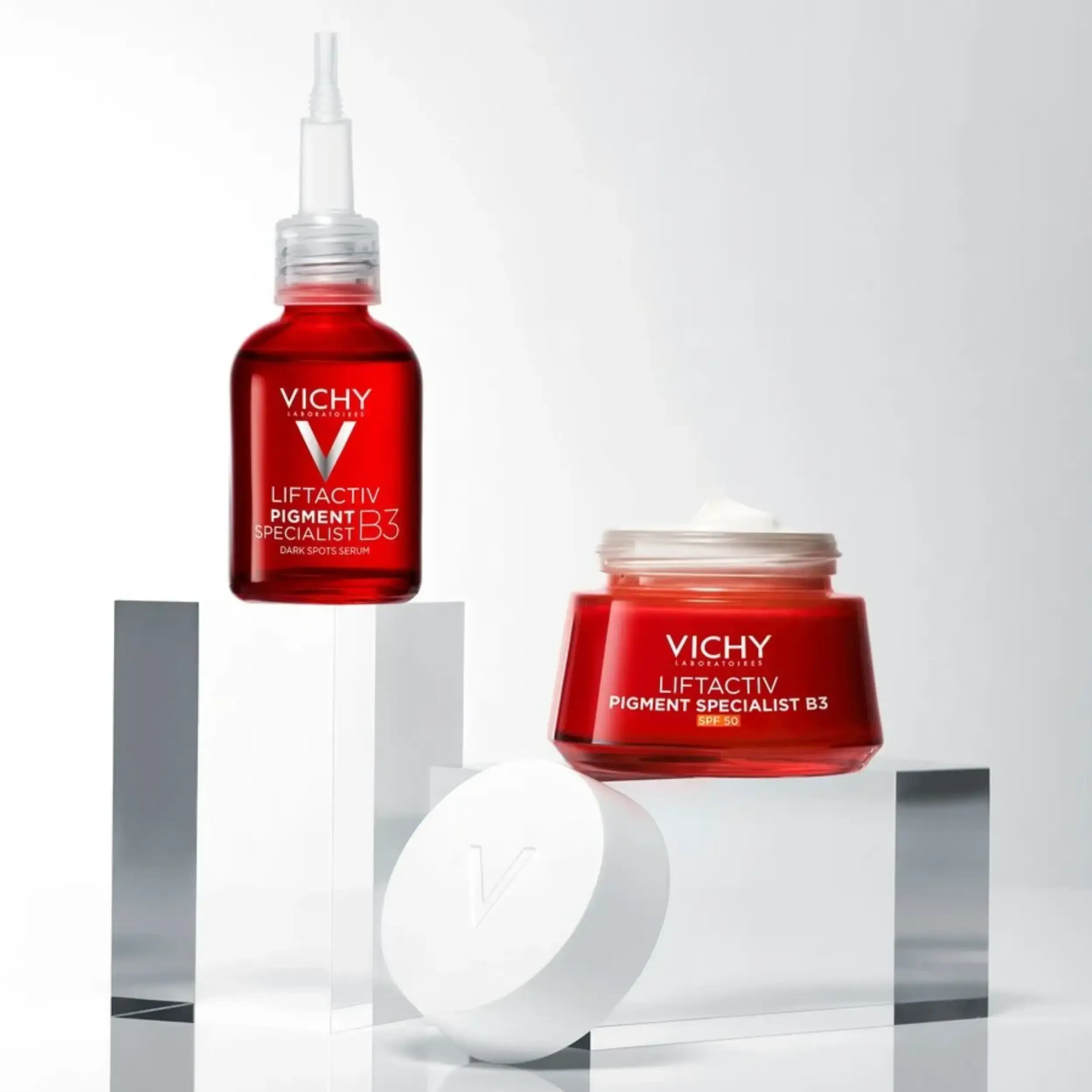 Vichy Liftactiv Pigment Specialist B3 SPF50 Day Cream exposure to external aggressors like pollution and UV rays leads to an increase in pigmentation and dark spots. Hormonal fluctuations during menopause, puberty, and pregnancy can further contribute to uneven skin tone and visible marks. Vichy Liftactiv B3 Anti Dark Spots Cream SPF50 is designed to correct and minimize pigmentation while reducing the appearance of wrinkles. This advanced formula features Niacinamide (Vitamin B3), a powerful dermatological ingredient, along with LHA, a gentle exfoliating active that helps resurface the skin.