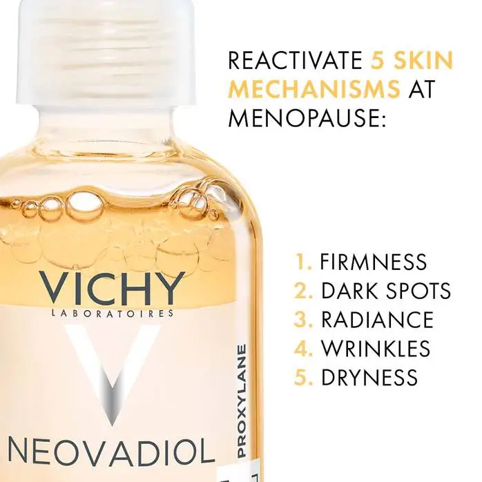 Vichy Neovadiol Meno 5 Bi-Serum acts in the five visible signs of menopause on the skin: wrinkles, sagging, dryness, dullness, and uneven tone. This bi-phase serum works to replenish, firm, and revitalize post-menopausal skin. Its lightweight, fast-absorbing texture delivers intense hydration and nourishment, helping to restore skin density, improve elasticity, and reduce pigmentation. With regular use, skin appears firmer, smoother, and more radiant. Dermatologically tested, this hypoallergenic serum is suitable for sensitive skin and is free from parabens.