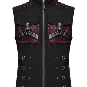Punk Rave Mens Apocalyptic Gothic Mesh Utility Pocket Waistcoat Vest Black Red